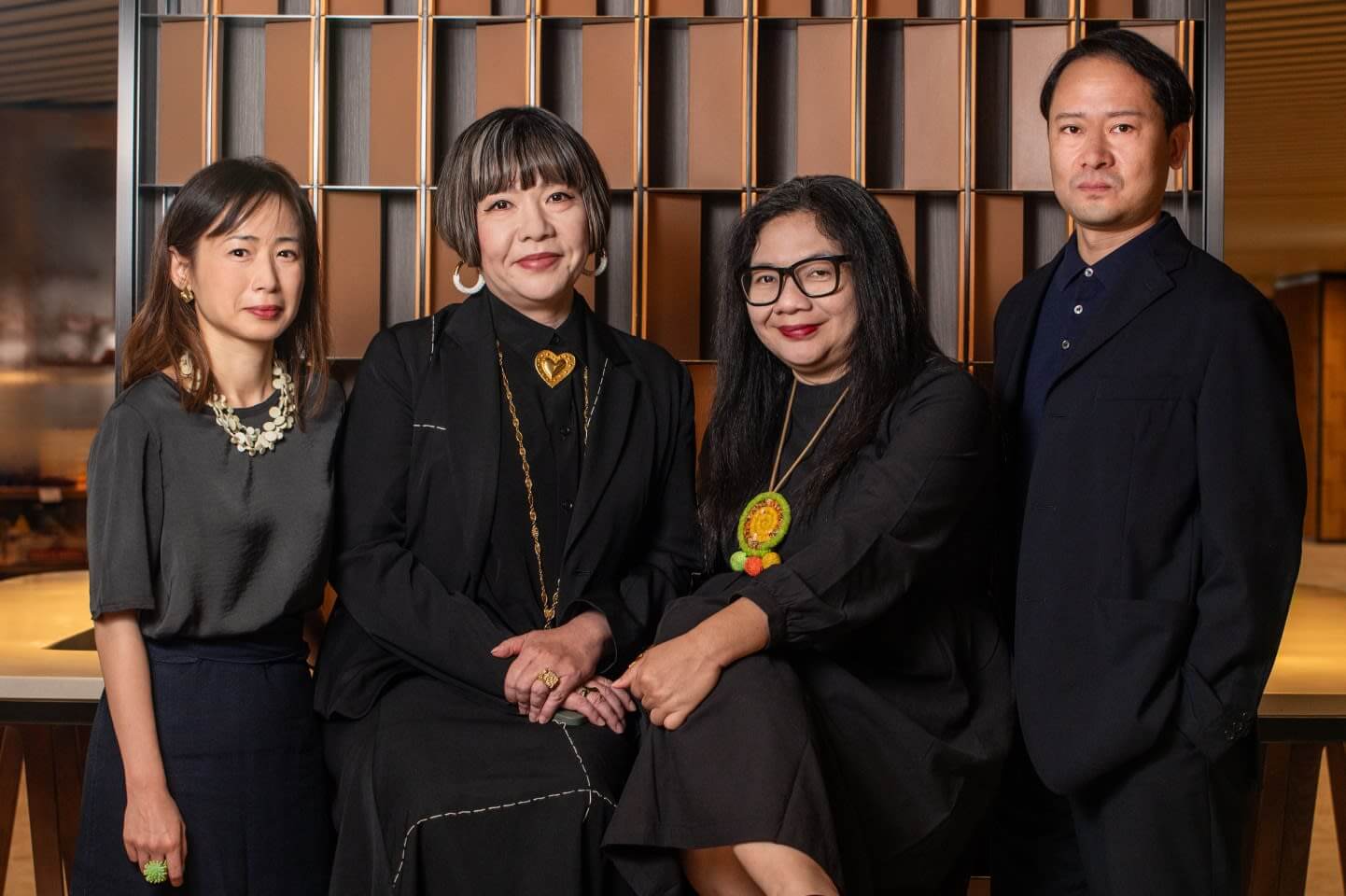 Group photo of the Encounters curators. Courtesy of Art Basel. From left to right:Isabella Tam (Curator of Visual Art, M+, Hong Kong), Mami Kataoka (Director of Mori Art Museum, Tokyo), Alia Swastika (curator, researcher, and writer, Jakarta), and Hirokazu Tokuyama (Senior Curator, Mori Art Museum). Courtesy of Art Basel and Ben Marans.