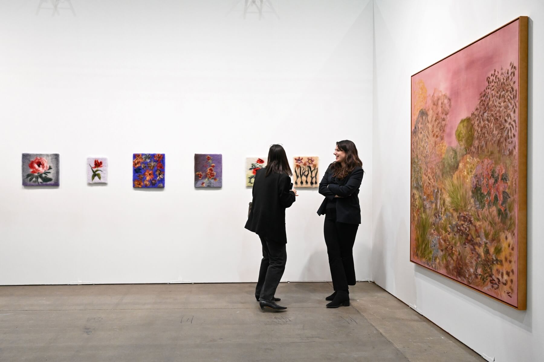 洛杉磯的藝廊 Megan Mulrooney 本次帶來藝術家凱特·齊默曼·特平(Kate Zimmerman Turpin) 色彩濃郁的花卉風景,以及瑪麗亞·扎卡茨(Maria Szakats) 馬海毛纖維上的細緻花卉,在午後便已被藏家橫掃一空。而倫敦的 Public Gallery 帶來紐約藝術家泰勒·西蒙斯(Taylor Simmons) 作品,其定價在 3,000 至 20,000 美元之間(約臺幣 9 萬 5 千至 63 萬元),亦於首日迅速完售。