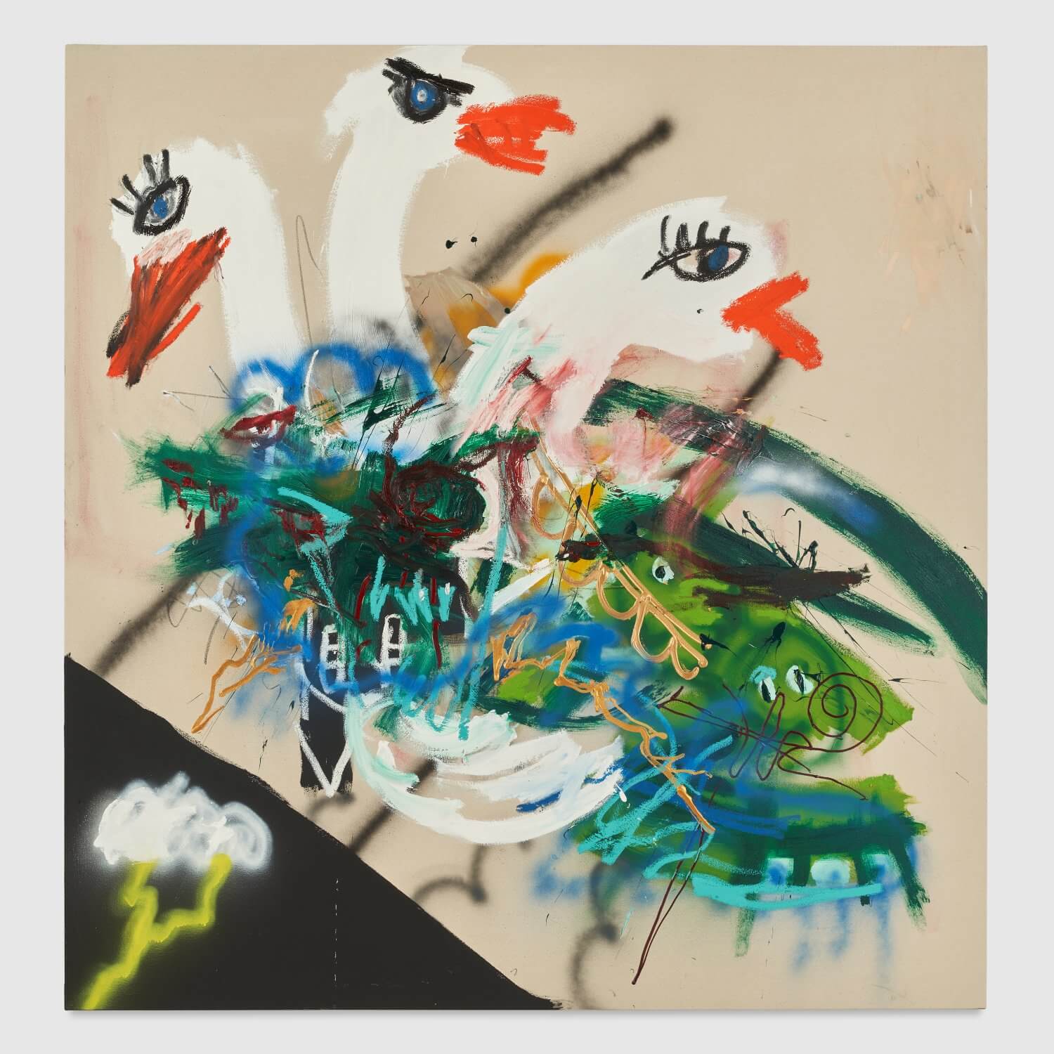 Robert Nava, Forgiveness Swan, 2024, oil, acrylic, and grease pencil on canvas, 190.5 x 182.9 cm. Courtesy of the Artist and Night Gallery.