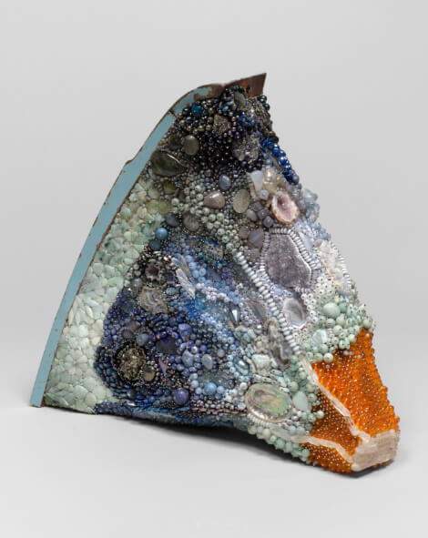 Kathleen Ryan, Bad Orange (Deep Blue), 2026. Amazonite, labradorite, sodalite, celestite, angelite, agate, sesame jasper, lapis lazuli, kyanite, pyrite, hematite, magnesite, amethyst, druzy quartz, smoky quartz, abalone, freshwater pearl, marble, glass, acrylic, steel pins on coated polystyrene, and car fender, 18½ × 21½ × 7½ in. Courtesy of the Artist and Karma Gallery.